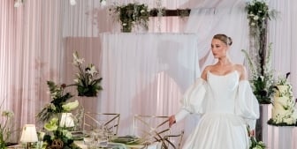 • A bride dressed in a white gown and holding a bouquet of white roses.