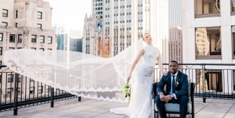 • A bride and groom say their vows during their outdoor wedding on the sunny rooftop patio at The Gwen.
