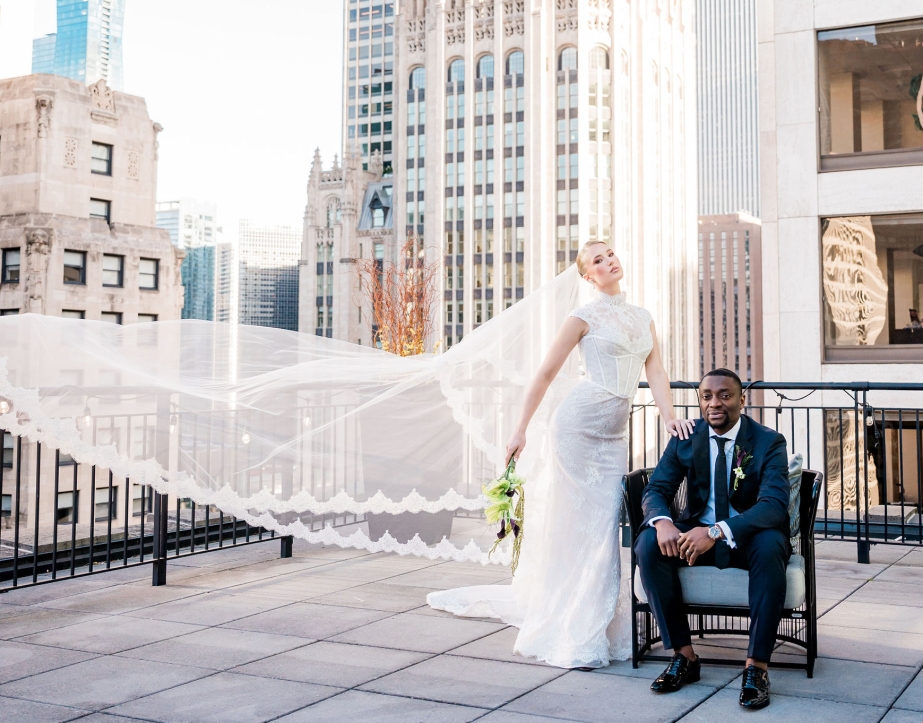 • A bride opening french doors on the Gwen's balcony in downtown Chicago.